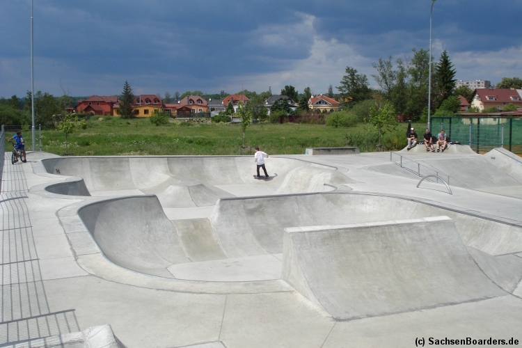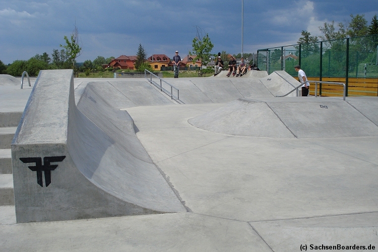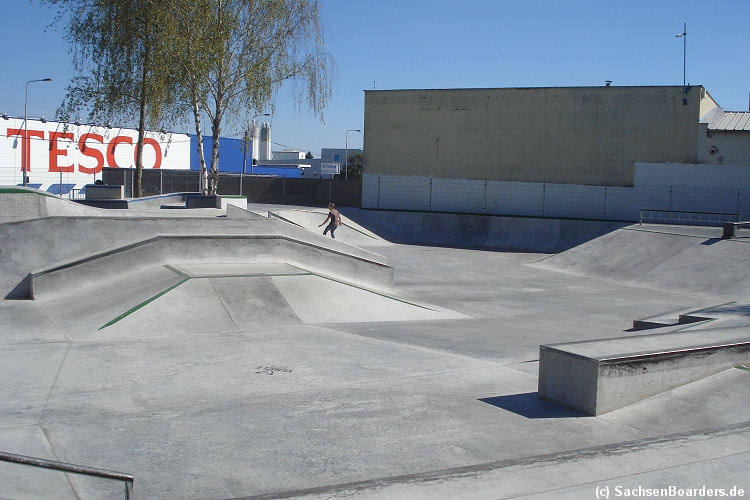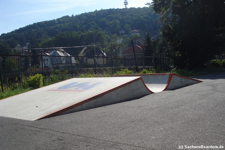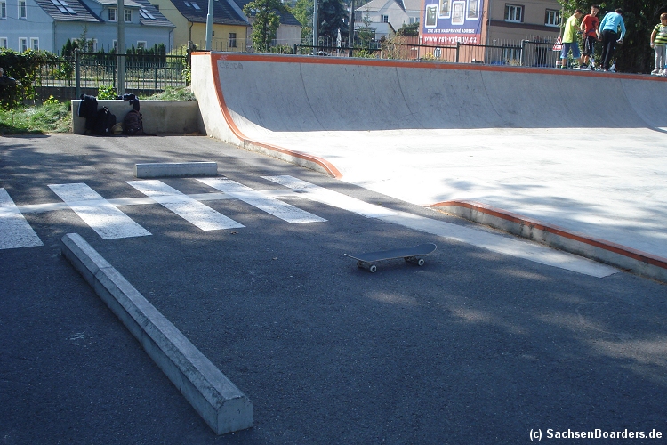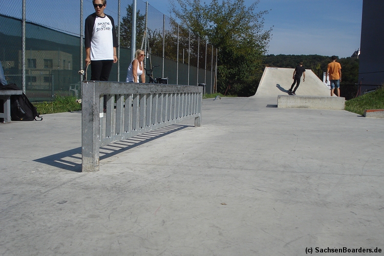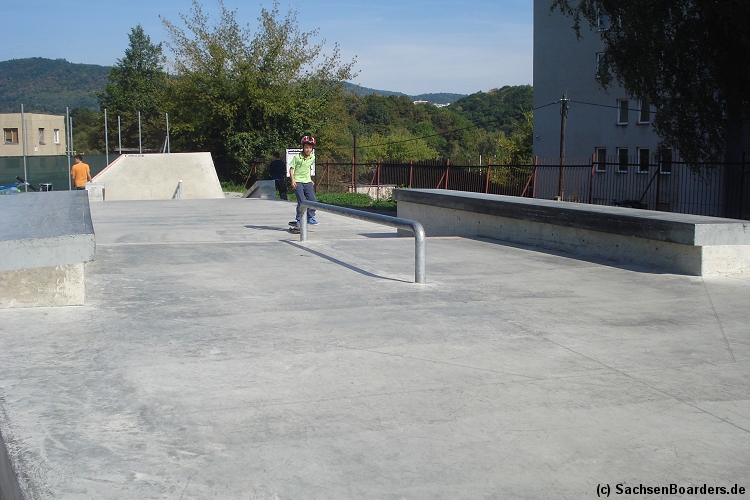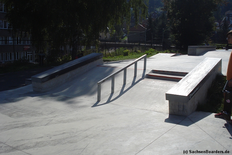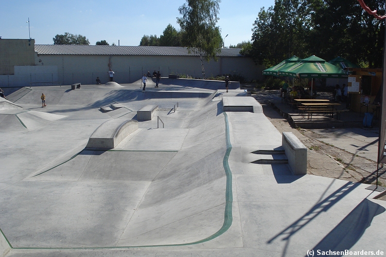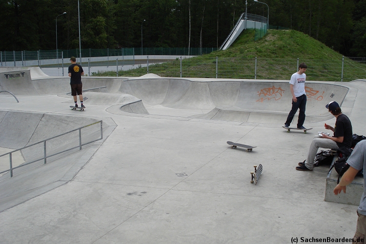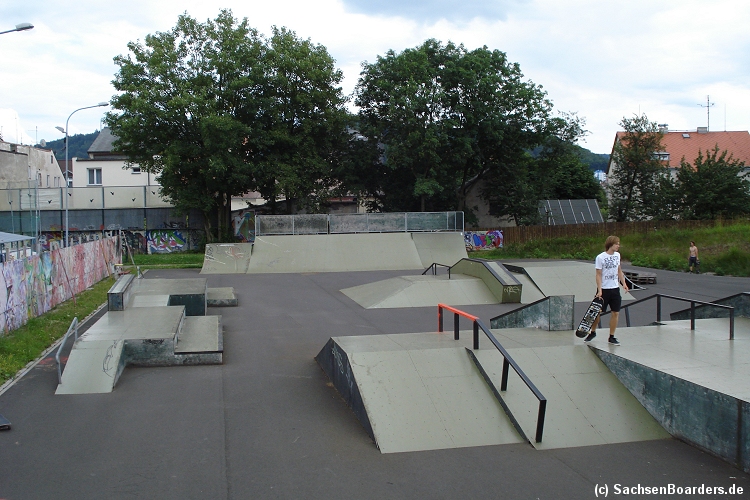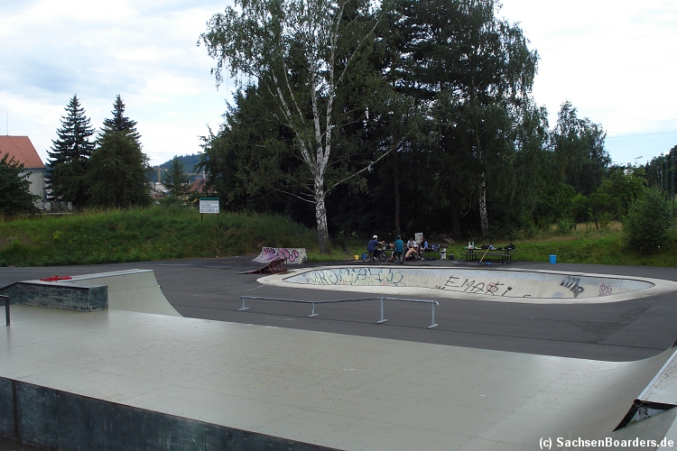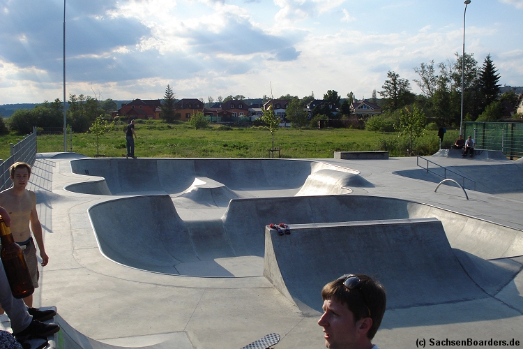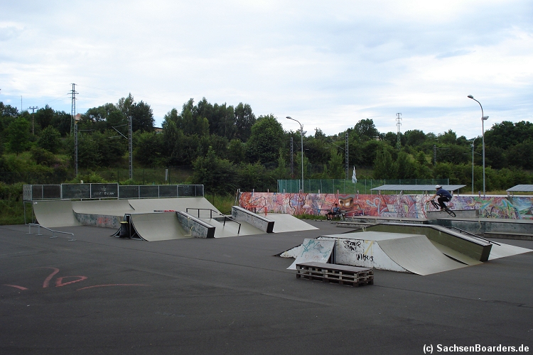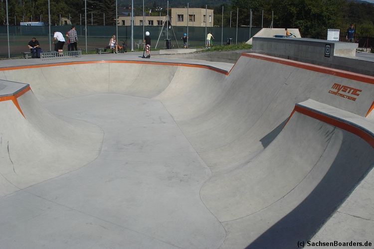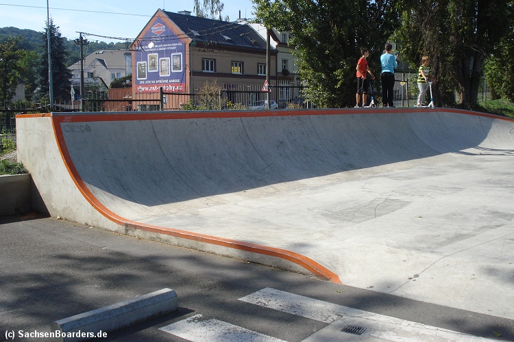 Nur etwa eine Autostunde südlich von Chemnitz, am Fuße der böhmischen Seite des Erzgebirges, gibt es gleich 2 Parks in einem und noch einen großen Holzbowl dazu. Einziges Manko ist das auf den Walls des Bowls breit geschmierte Wachs, das vor unseren Augen von einem Inliner demonstrativ auf das Coping gerieben wurde.