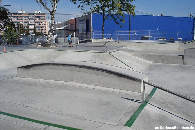 Beton Rampen: diverse Curbs, Ledges, banks, Flatbar, Downrail, Doublekink Rail, Manual Boxes (z. T. mit Gap), Curved Ledge, Gap, Treppen